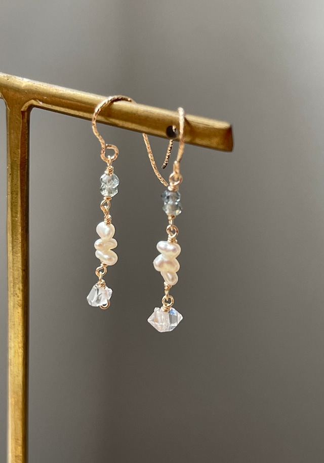 キラキラの輝きと、ふんわり優しい雰囲気が まるで天使達が楽しそうにお話ししているような 美しくハッピーなピアスです。 アイオライト、淡水パール、 ハーキマーダイヤモンドを贅沢に使用しています。 華奢なピアスでサラッとつけられるのもオススメポイントです♡ 石 アイオライト、淡水パール、ハーキマーダイヤモンド 金属 14kgf 長さ 全長約3cm ●送料無料 ネコポス ●ご購入前にプロフィール欄をご覧下さいませ。