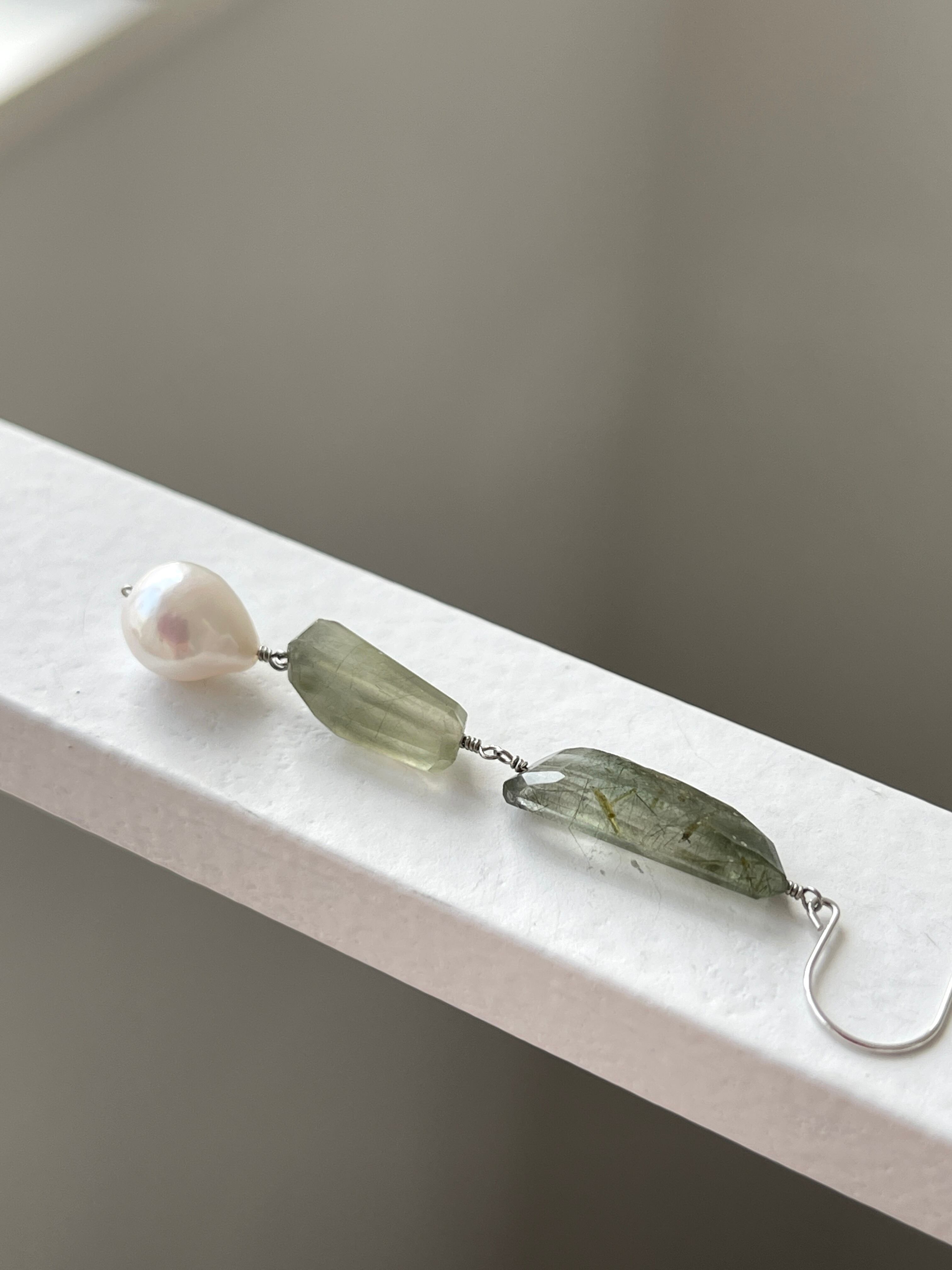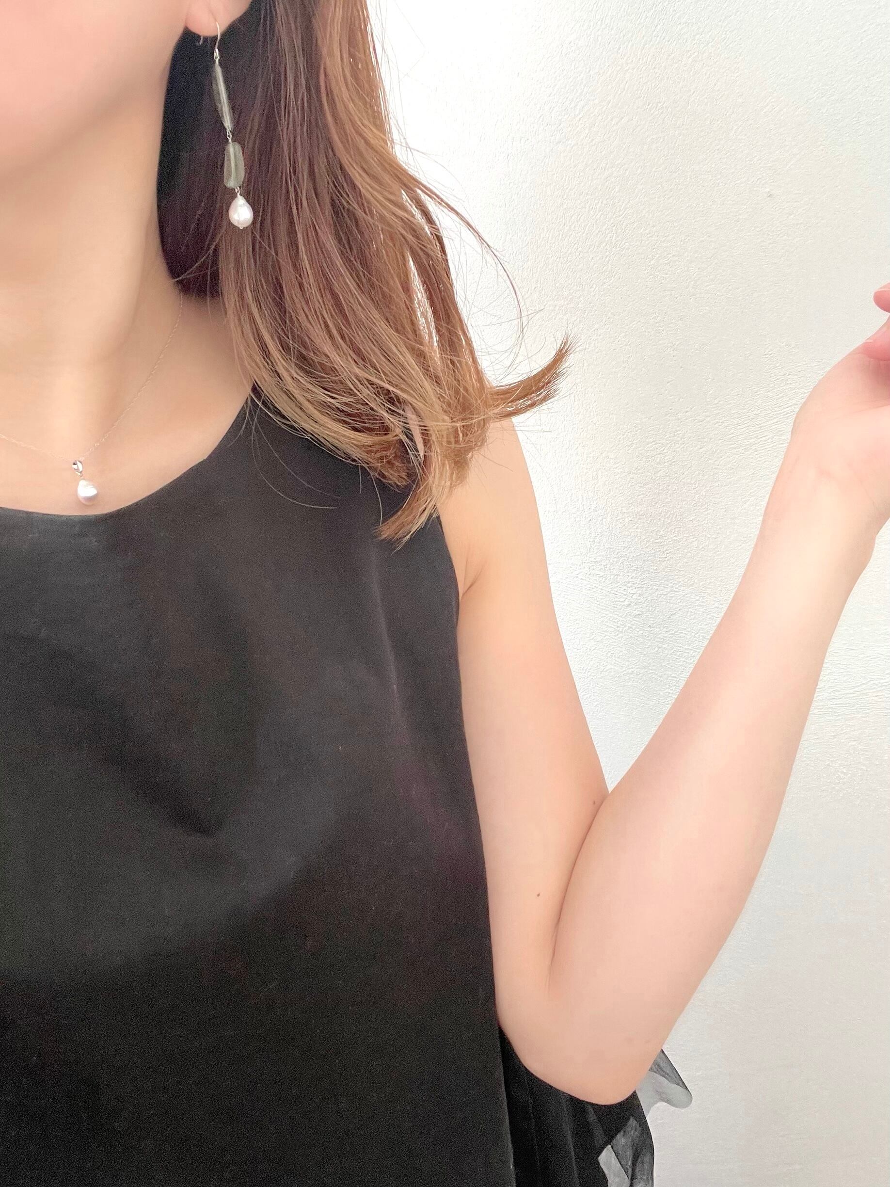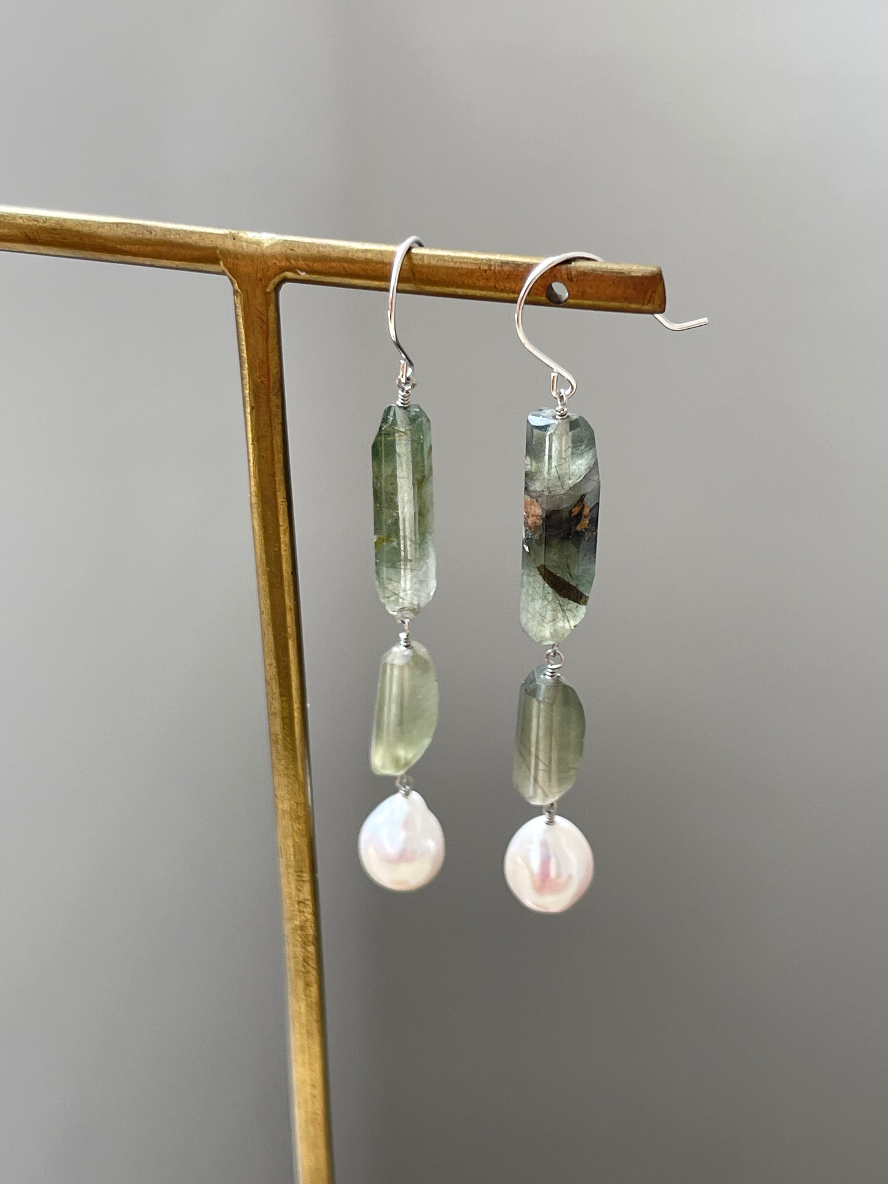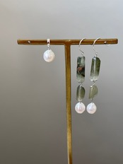 グリーンルチルクォーツと淡水パールのピアスです。