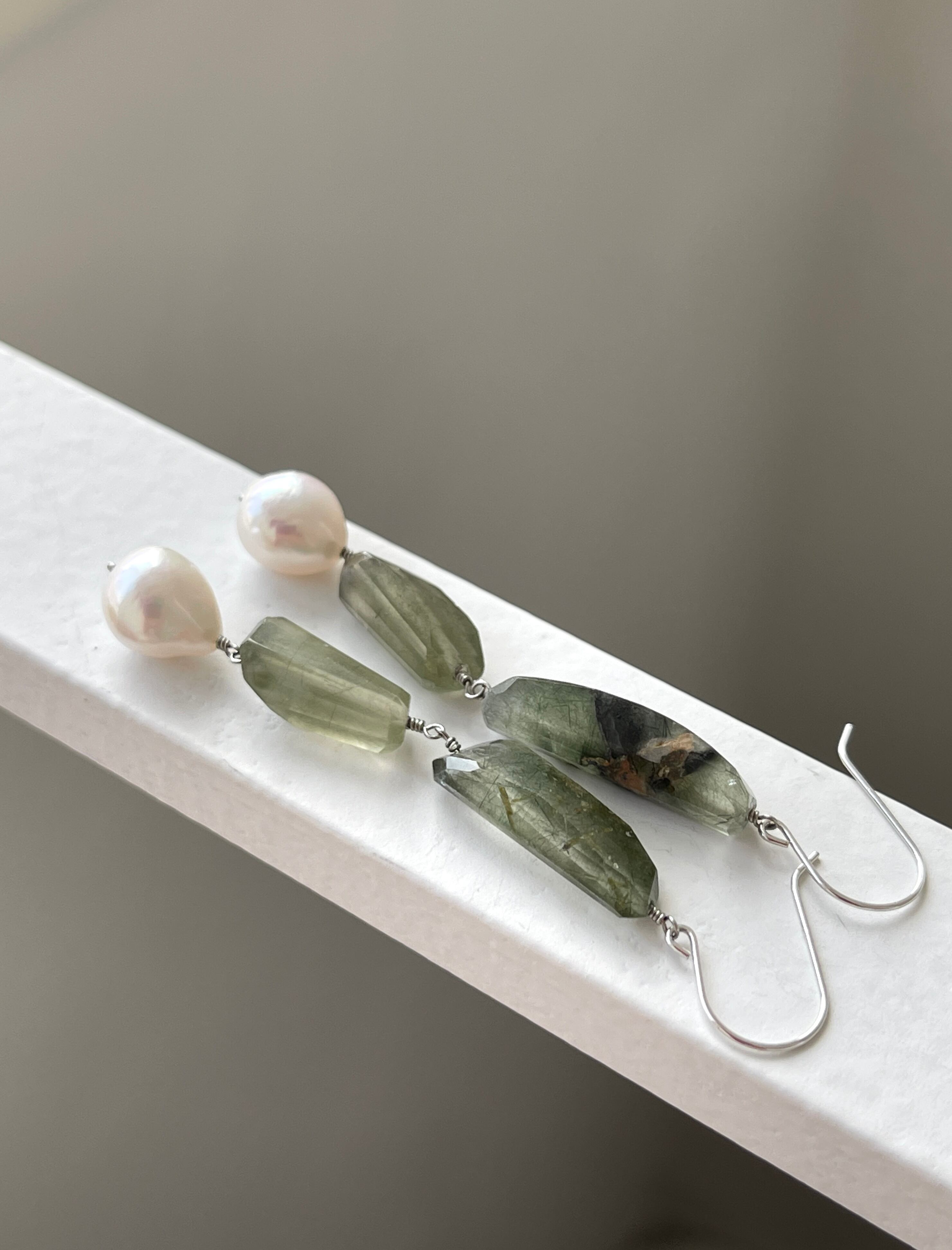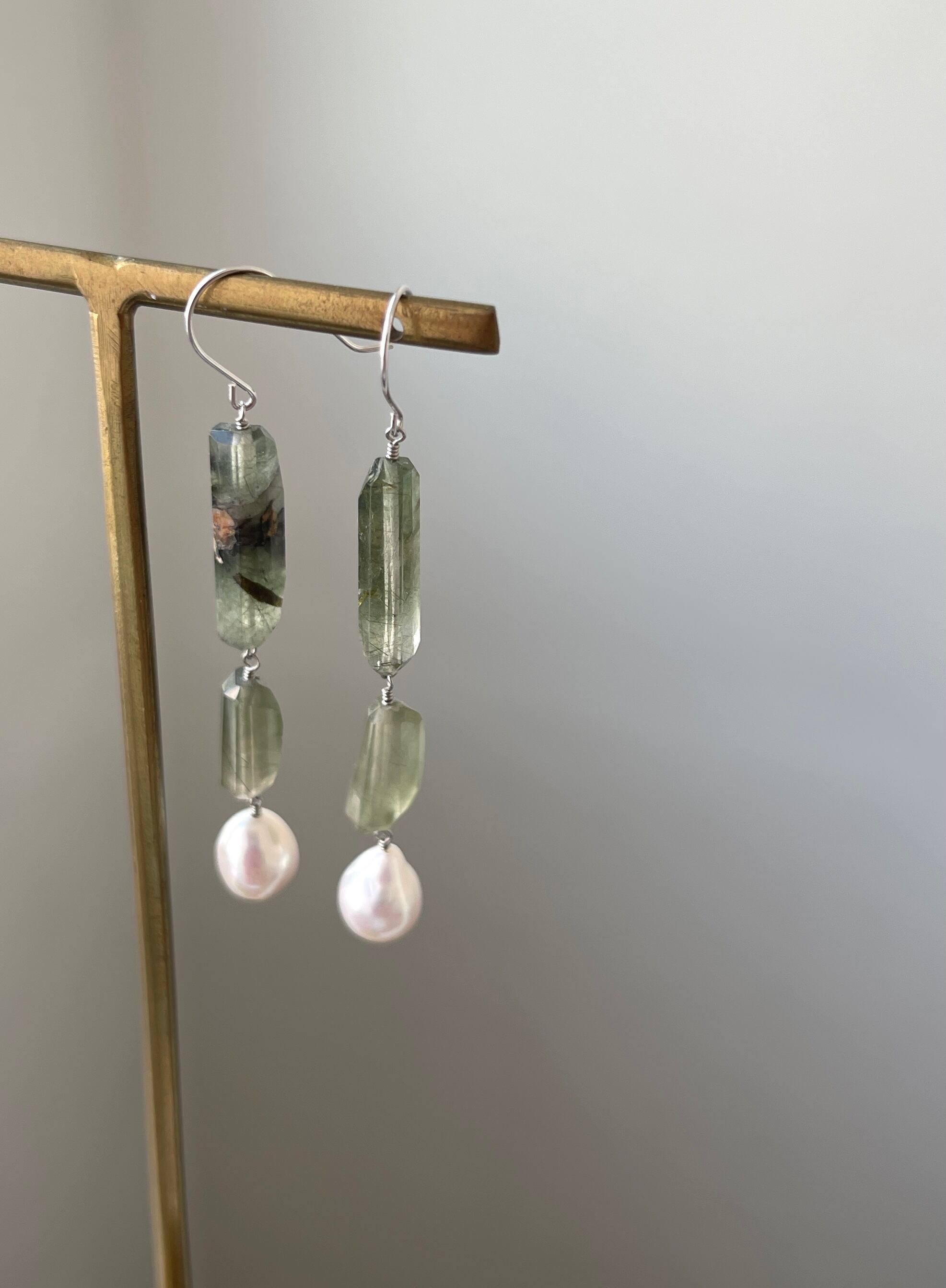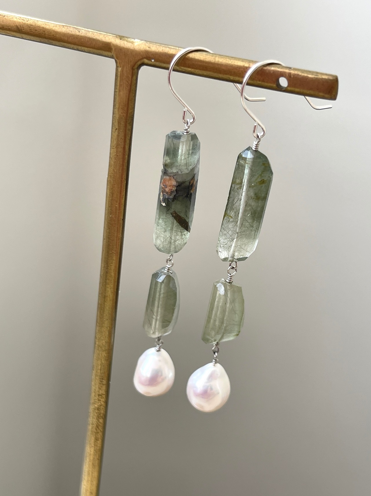 グリーンルチルクォーツと淡水パールのピアスです。