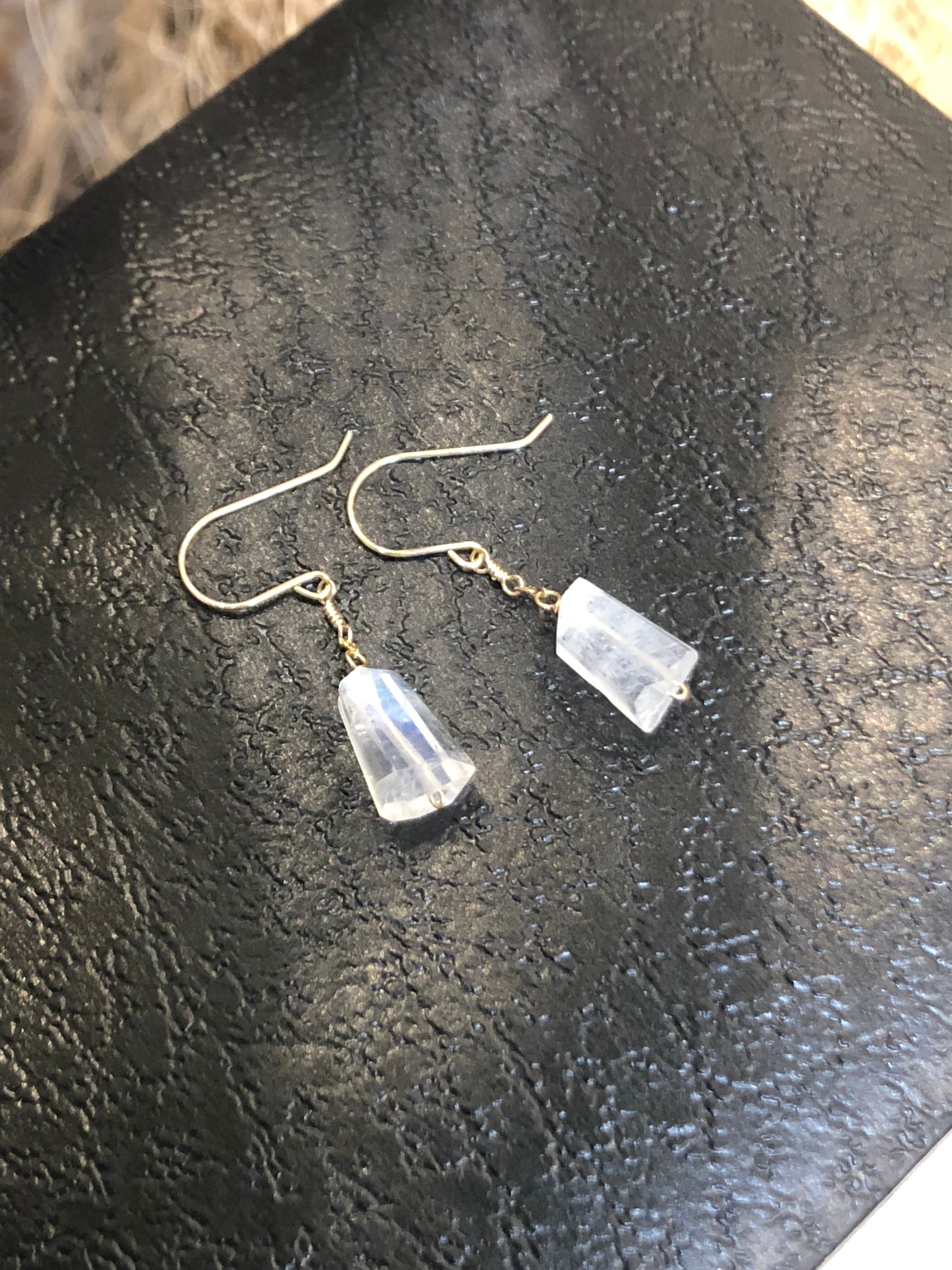 優しいムーンストーンの輝きとカット面が不規則なタンブルカットが魅力的なピアスです。