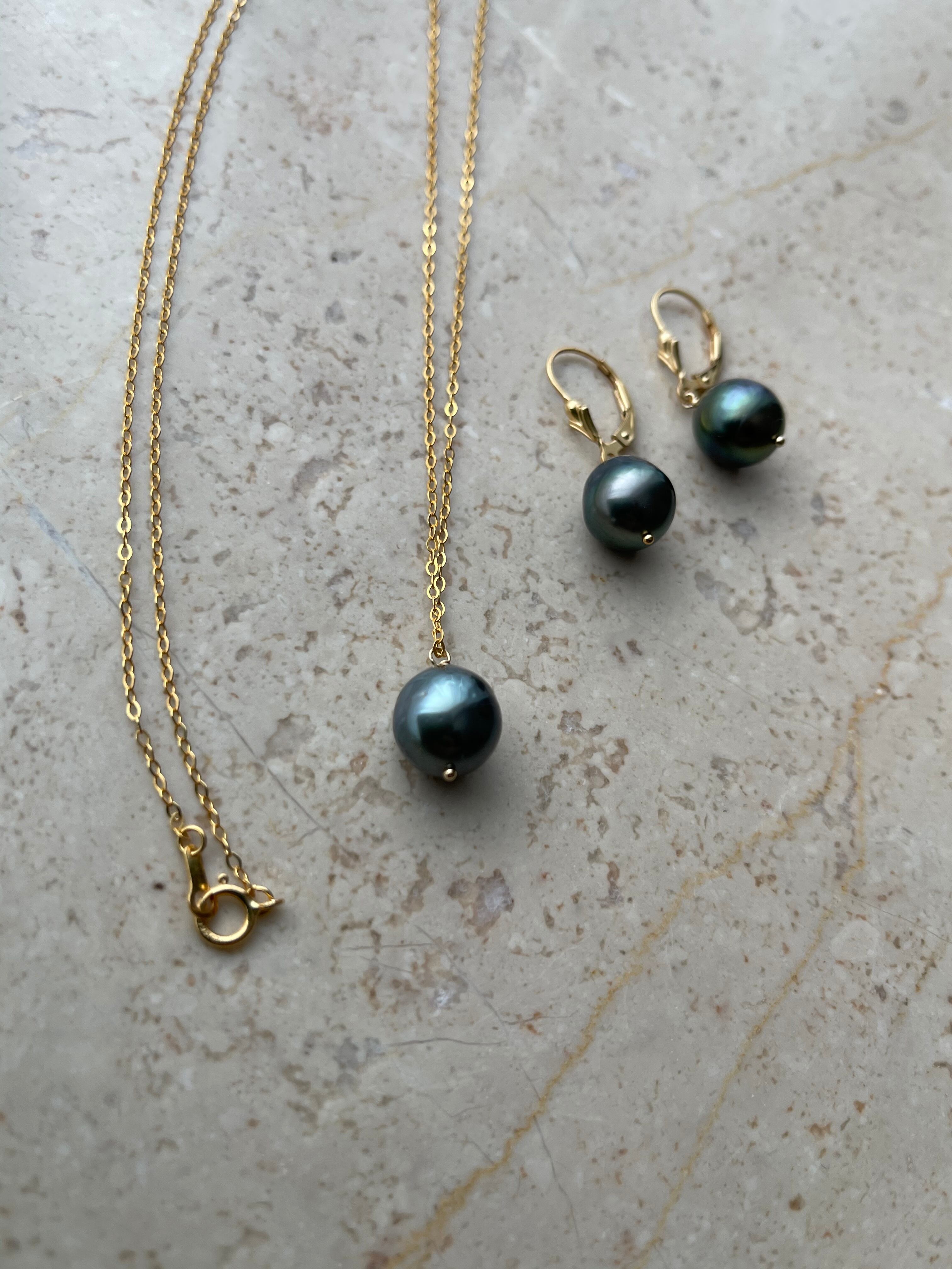 照りの良いタヒチアンパールのピアスとネックレスのセットです。