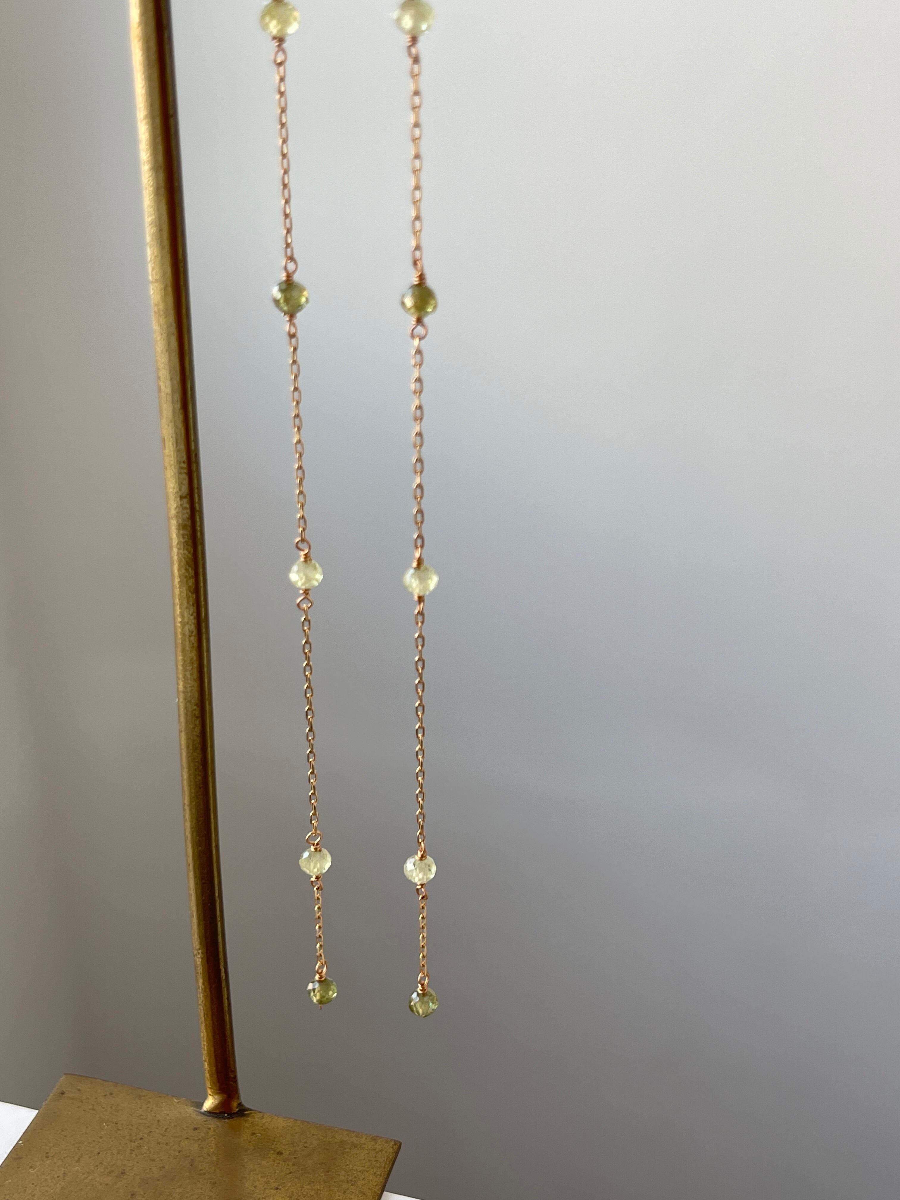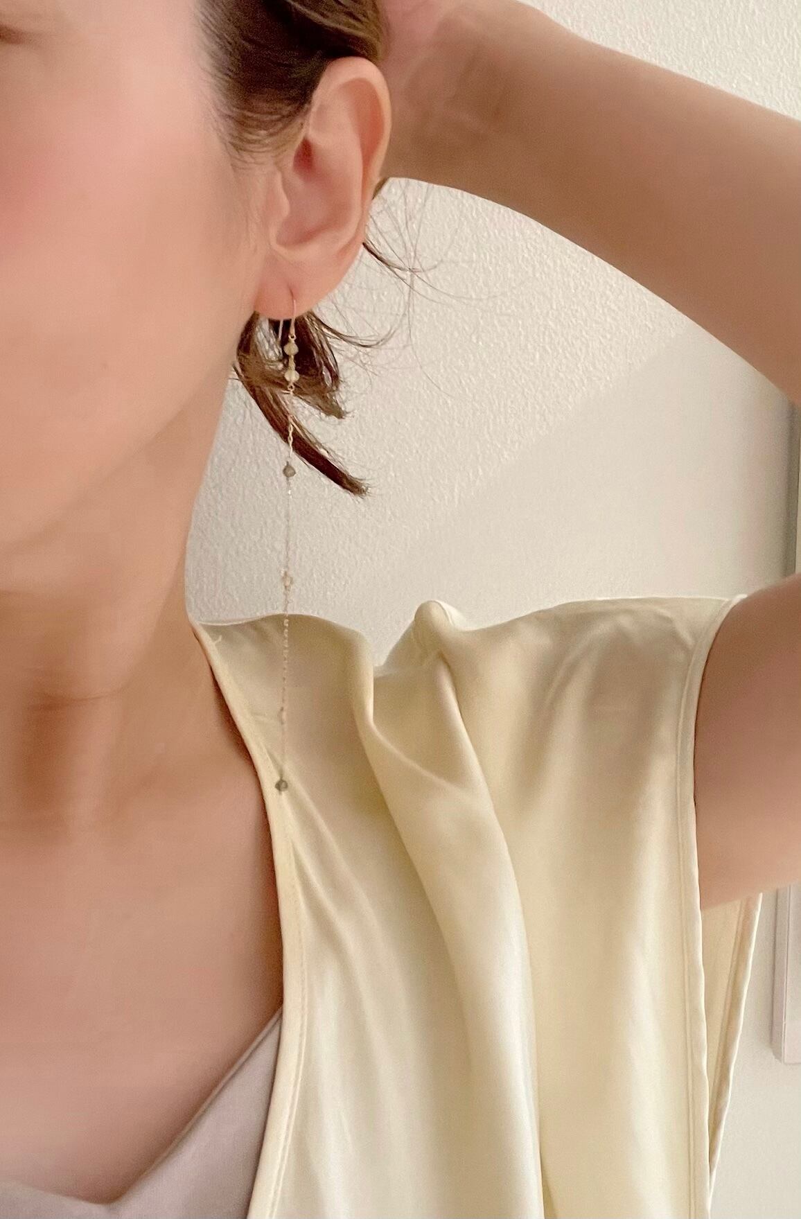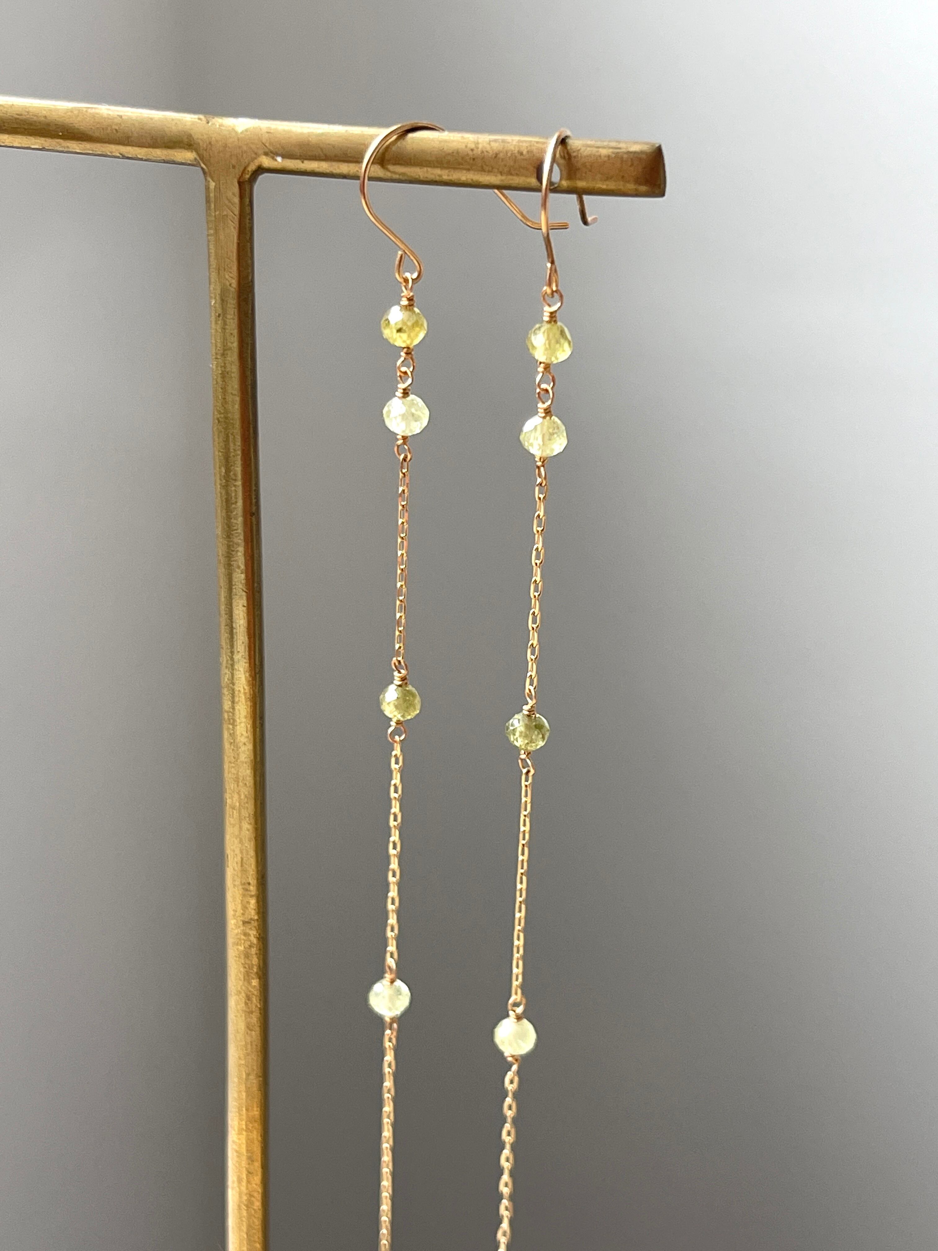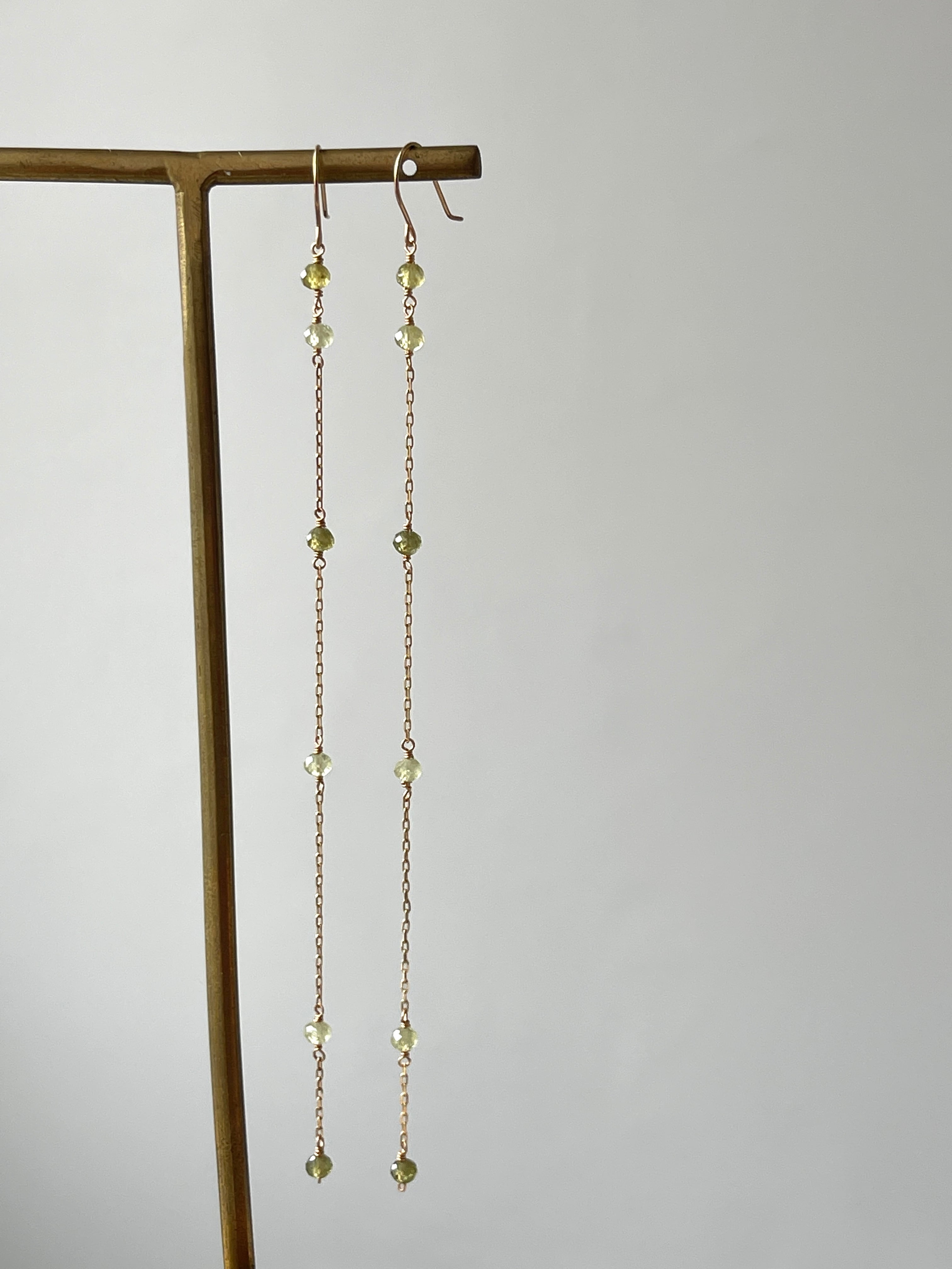 優しいグリーンカラーとゴールドチェーンの華やかな輝きで、とても品が良く美しいロングピアスが入荷しました。